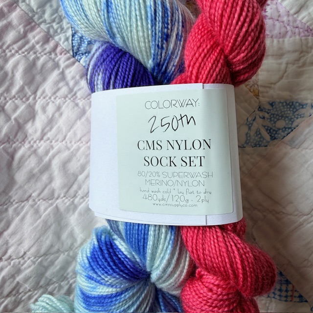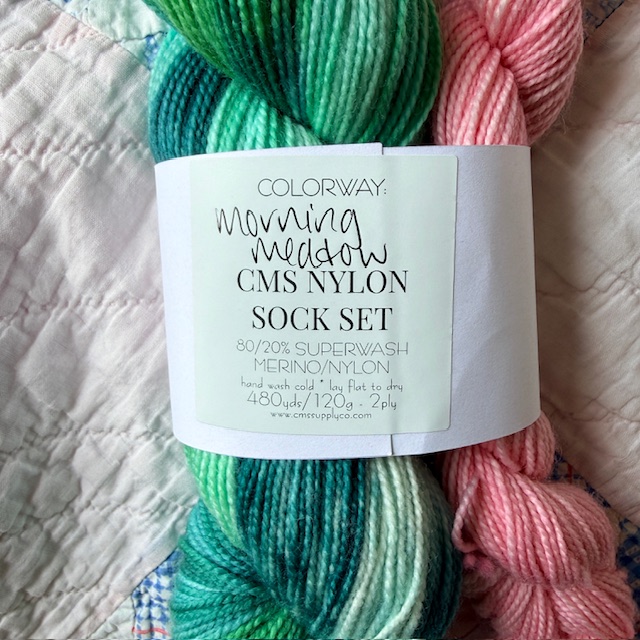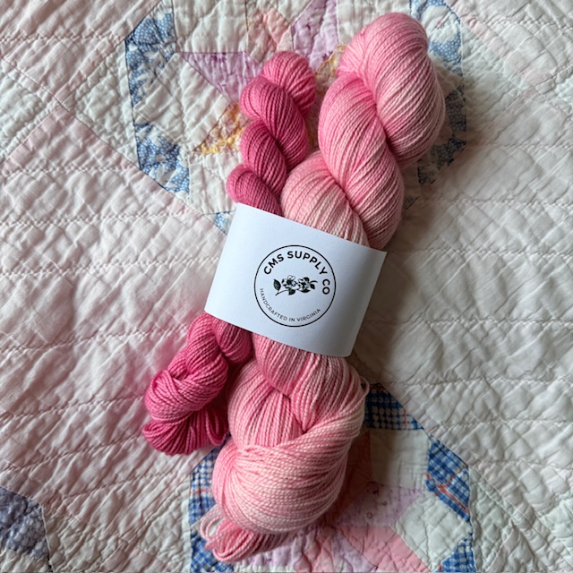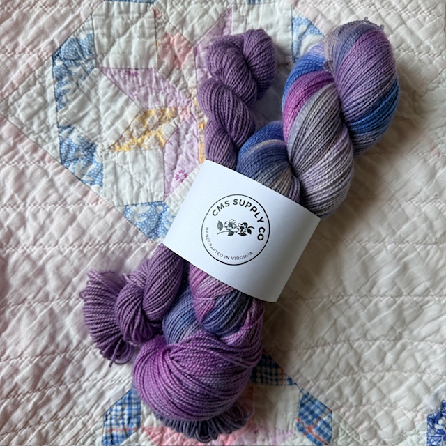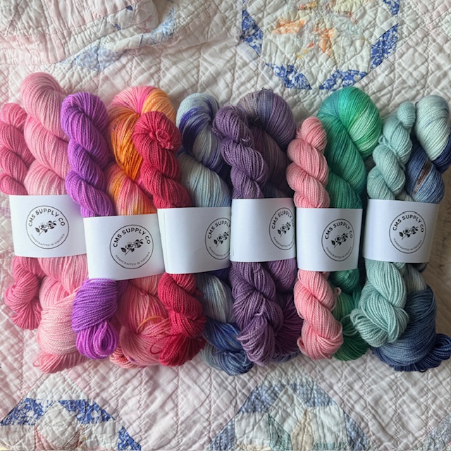 CMS Supply Co Hand-dyed Yarn : I have curated the sock set yarn from a wonderful Northern Virginia Indie Yarn Dyer. Cady from CMS Supply Co starting dyeing yarn in 2019 and just loves mixing and playing with colors. Her business is truly a family one with her 13 year old son washing dye pans, and her marine vet husband helping with packaging and shipping.