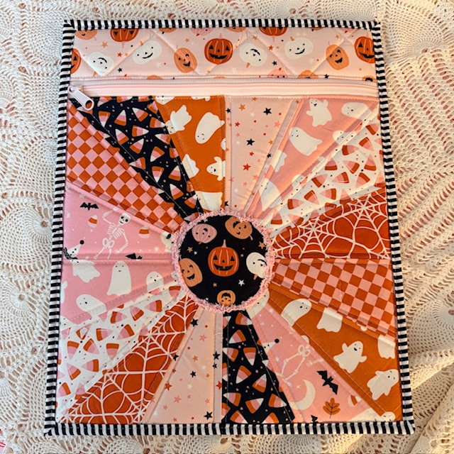 - Made with foundation paper piecing technique taught in class, quilting front & back, long pull zipper and binding