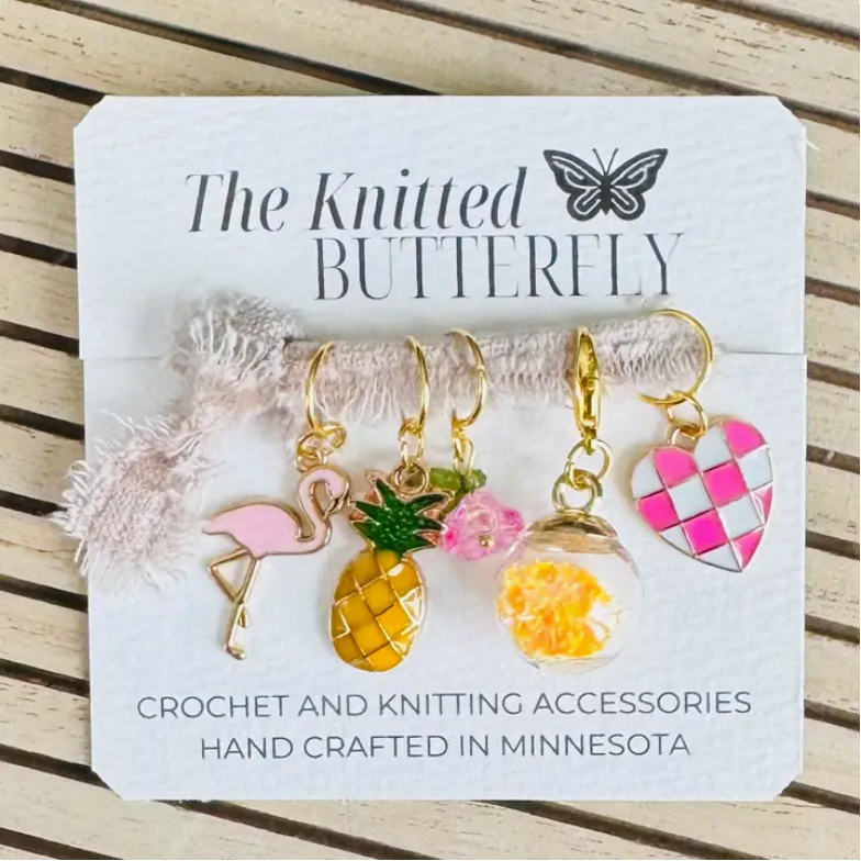 The Aloha stitch marker set features a playful design with a pineapple, flamingo and other festive colors. Perfect for keeping track of your knitting or crochet progress. Add a touch of tropical charm to your crafting projects with this delightful progress keeper! Set of 5 * 4 regular sized stitch markers and 1 progress keeper. *Regular stitch markers fit up to 8MM/US 11 Knitting needle.
