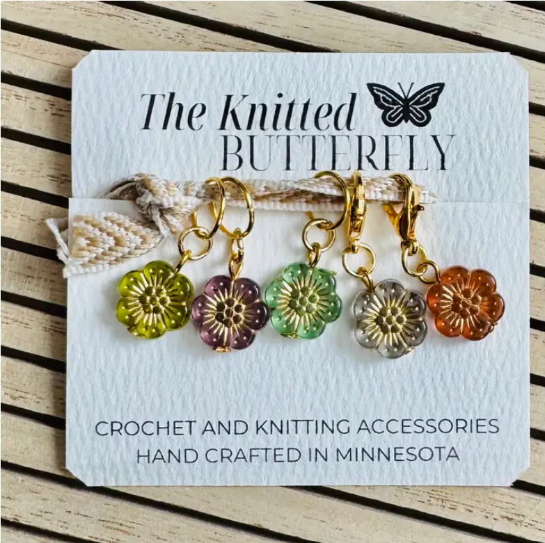 The March of the Flowers set features vibrant, flower-inspired stitch markers and a progress keeper, perfect for adding a colorful touch to your knitting or crochet projects. Keep your progress stylishly on track with this charming accessory collection. Set of 5 * 3 regular sized stitch markers and 2 progress keepers. *Regular stitch markers fit up to 8MM/US 11 Knitting needle.